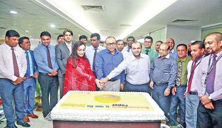 Bashundhara Group Chairman Ahmed Akbar Sobhan, Vice-Chairman Safwan Sobhan and Director Yeasha Sobhan cut a cake at Bashundhara Industrial Headquarters-2 in the capital on Monday to celebrate Bashundhara Paper brand winning ‘Superbrands’ award. Other officials of Bashundhara Paper Mills Limited were also present on the occasion.