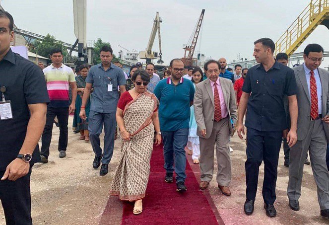 Indian High Commissioner in Bangladesh Riva Ganguly Das, Bhutanese ambassador Sonam T Rabgye and Bashundhara Group vice-chairman Safwan Sobhan received the cargo ship at Meghna Ghat in Narayanganj.